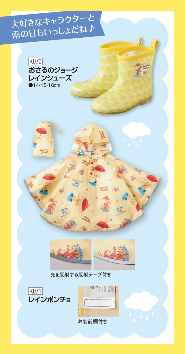 雨の日も楽しくお出かけ。キャラクター柄のキッズレインブーツです。 底までかわいい総柄入り。他人の靴と間違えないネームタグ付き。 左右がわかるイラスト付きなので左右も間違えません。ブーツの後ろ側に反射テープ付き。