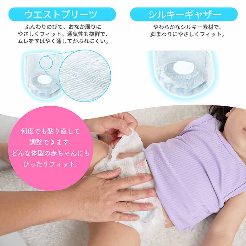 パンツタイブでありながら、赤ちゃんの微妙なサイズの個人差に合わせて、 調整を可能にした新技術であるリファスナブル機能。 ・シルキーフック 赤ちゃんの体に合わせてぴったりフィット。おなかまわりや脚まわりが細めの子も安心・快適。両サイドから伸ばして、何度でもはり直して調整できる。 ・まるごとシルキー素材 おむつ替えをするママ・パパのためにも。さわり心地のいい全画なめらかシルキー素材。 ・シルキーギャザー やわらかなシルキー素材だから、ゴム跡がつきにくく、繊細な肌にやさしい。モレもしっかり防いで安心です。 ・ウエストプリーツ ふんわりのびて、おなかまわりにやさしくフィット。 ・3Dシート 絹のようになめらかな超極細提維を採用し、でこぽご立体加工に。肌に触れる部分はいつも やわらか、さらさらで、こすれ、かぶれを防きます。 ・"Thin-Dry"吸収体 おしっこをすばやく拡散&吸収するから、おしりはいつも快通です。どんなに動いても型崩れしない、薄型の吸収体"Thin-Dry"を採用しました