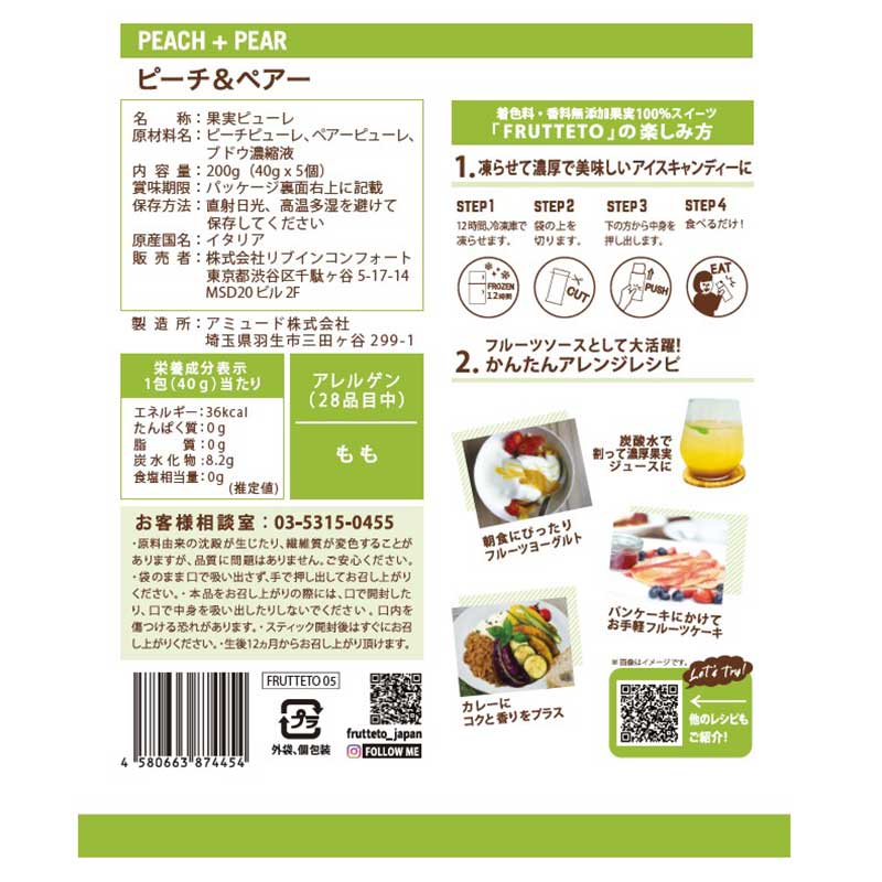 ●内容量:200g(40g×5個) ●原材料名:ピーチピューレ、ペアーピューレ、ブドウ濃縮液