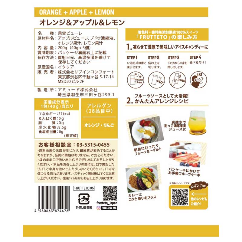 ●内容量:200g(40g×5個) ●原材料名:アップルピューレ、ブドウ濃縮液、オレンジ果汁、レモン果汁