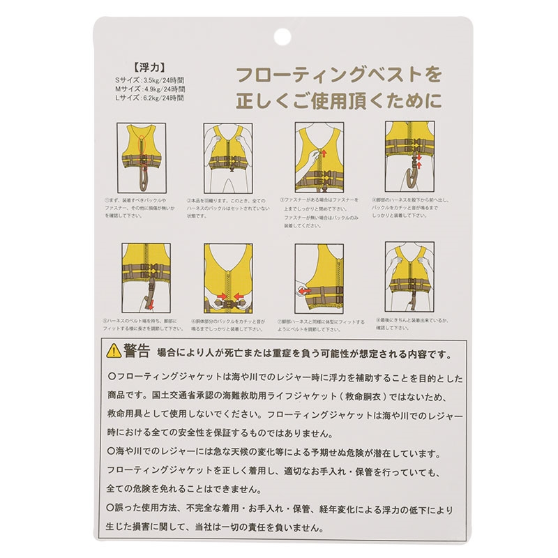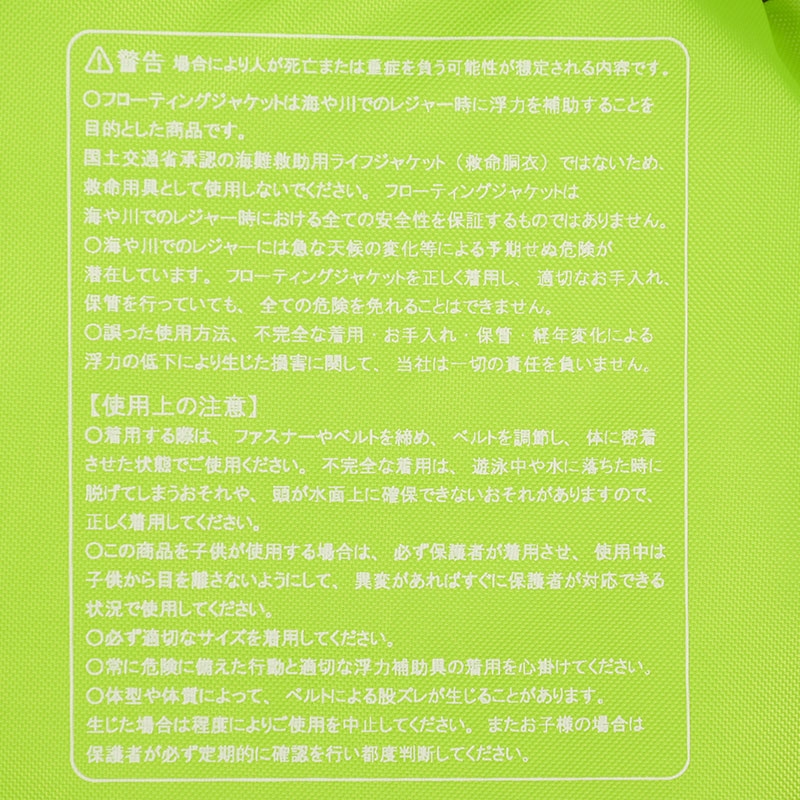 ●素材:[生地]ポリエステル100% [浮素材]EPE(発泡ポリエチレン) ●サイズ(約・cm):[Sサイズ]着丈41・身丈39・身幅40・肩幅7・裾幅39 ●推奨サイズ:[胸囲]70cmまで [身長]110~130cm ●浮力:3.5kg/24時間 ※フローティングジャケットは海や川でのレジャー時に浮力を補助することを目的とした商品です。 国土交通省承認の海難救助用ライフジャケット(救命胴衣)ではないため、救命用具として使用しないでください。 フローティングジャケットは海や川でのレジャー時における全ての安全性を保証するものではありません。 ※海や川でのレジャーには急な天候の変化等による予期せぬ危険が潜在しています。 フローティングジャケットを正しく着用し、適切なお手入れ、保管を行っていても、 全ての危険を免れることはできません。 ※誤った使用方法、不完全な着用・お手入れ・保管、経年劣化による 浮力の低下により生じた損害に関して、当社は一切の責任を負いません。