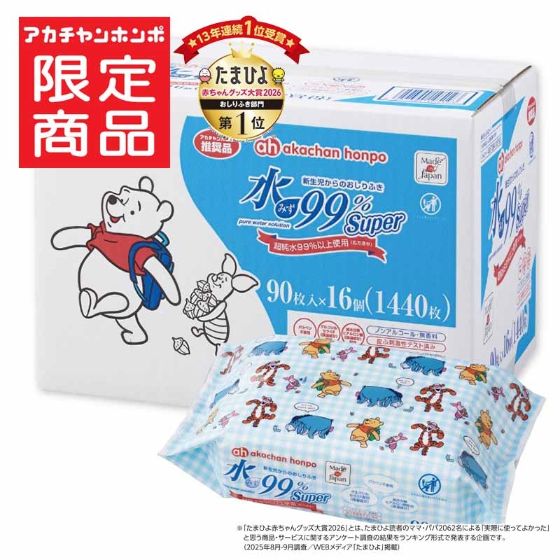 化粧品の技術で、新生児から使えるおしりふきをつくりました。 ●”水”にこだわり、超純水※1を99%以上使用しています。 ●防腐剤を必要最小限に抑えた赤ちゃんのおしりふきです。 ●パラベン、プロピレングリコール(PG)は配合していません。 ●お肌を健やかに保つ加水分解ヒアルロン酸(保湿成分)を配合しています。 ●お肌にやさしい弱酸性です。 ※1 水の精製技術を駆使して不純物を取り除いた、純度100%の理論上のH2Oに近い水のこと。 グルコシルセラミド(保湿成分)配合 加水分解ヒアルロン酸(保湿成分)配合 ノンアルコール・無香料 皮ふ刺激性テスト済み(すべての人に皮ふ刺激性を起こさないというわけではありません。) ※トイレに流さないでください (c) Disney. Based on the "Winnie the Pooh" works by A.A.milne and E.H.Shepard.
