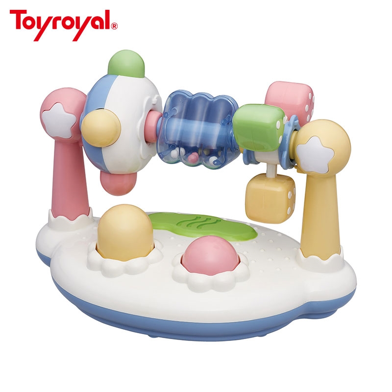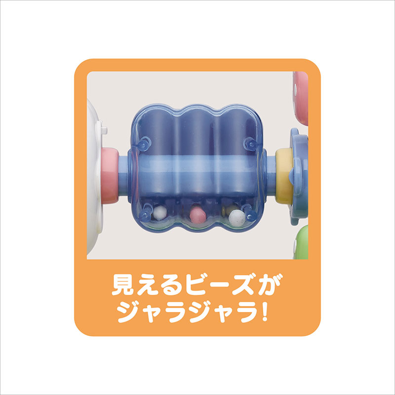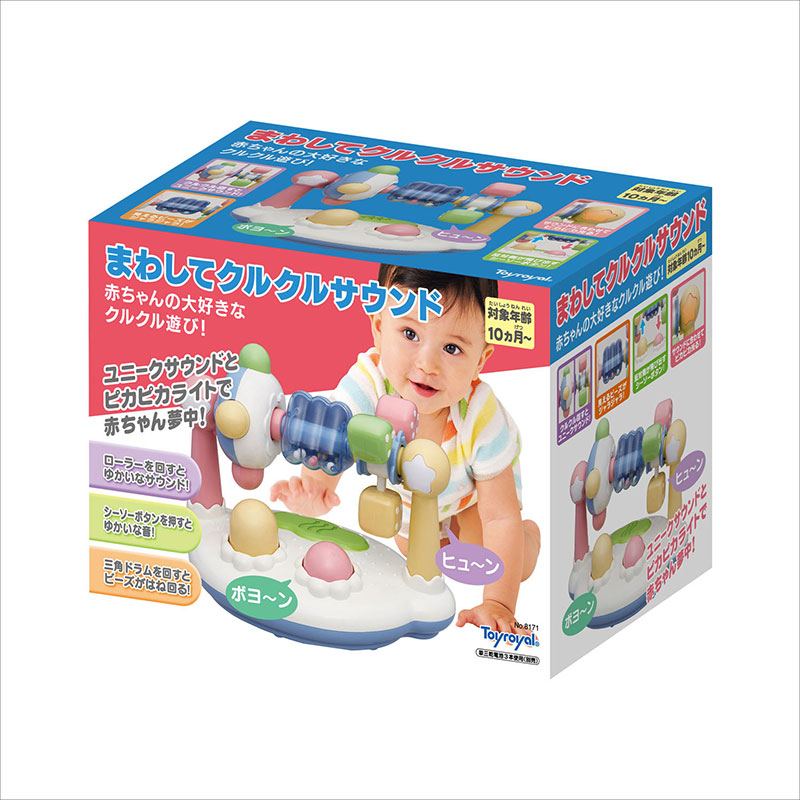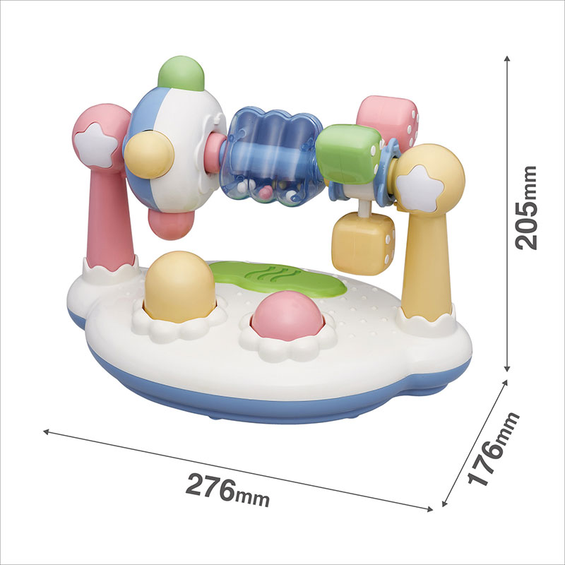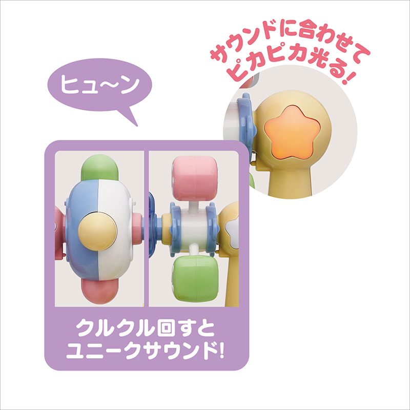 赤ちゃん大好きクルクル遊び。 夢中になるゆび遊びや手遊びで脳を刺激することで成長を促します。 ローラーを回すと愉快なサウンド。 シーソーボタンを押すと愉快な音。 三角ドラムを回すとビーズが跳ねまわる。楽しいクルクル遊び。
