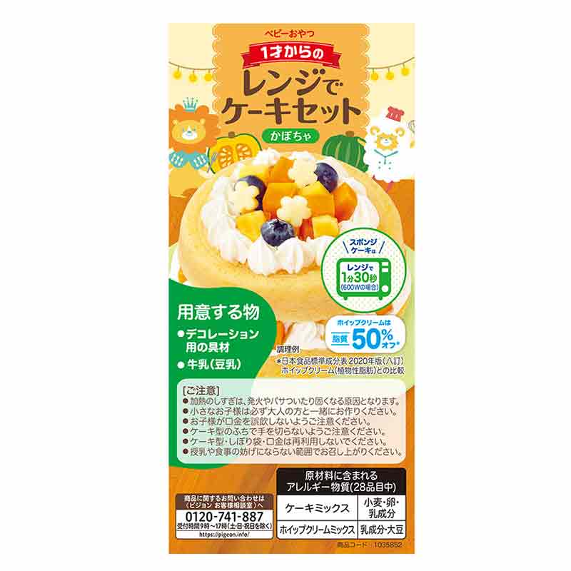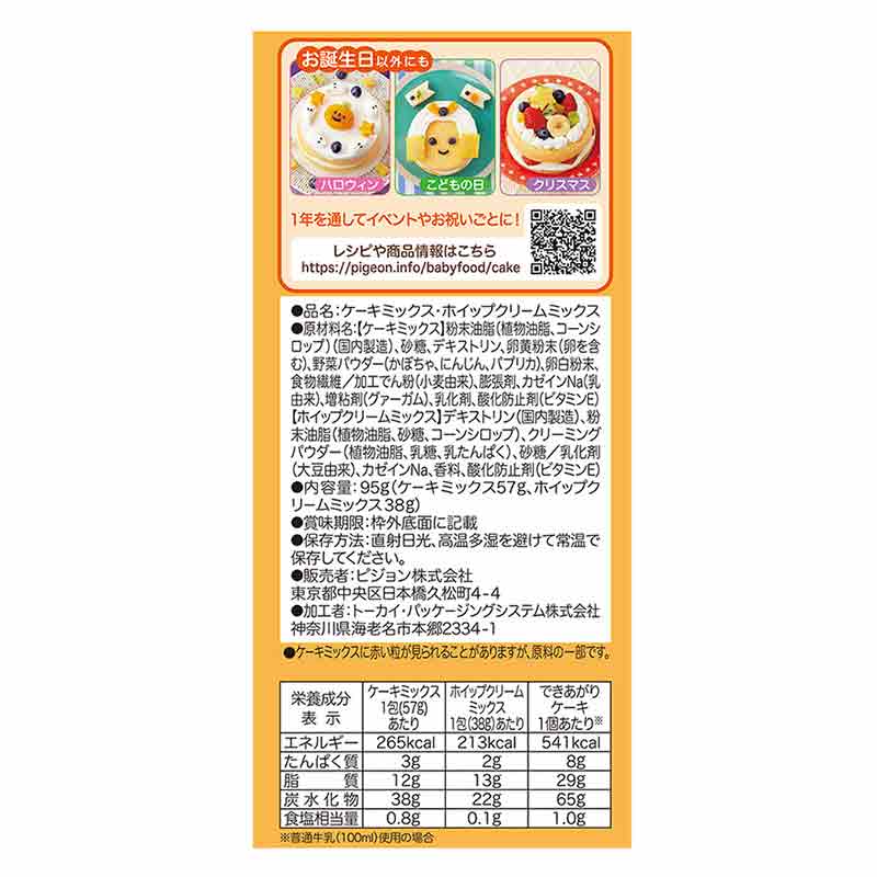 ●ケーキミックスに赤い粒が見られることがありますが、原料の一部です。 ●栄養成分表示 ・エネルギー ケーキミックス1包(57g)あたり265Kcal ホイップクリームミックス1包(38g)あたり213Kcal 出来上がりケーキ1個あたり※541Kcal ・たんぱく質 ケーキミックス1包(57g)あたり3g ホイップクリームミックス1包(38g)あたり2g 出来上がりケーキ1個あたり※8g ・脂質 ケーキミックス1包(57g)あたり12g ホイップクリームミックス1包(38g)あたり13g 出来上がりケーキ1個あたり※29g ・炭水化物 ケーキミックス1包(57g)あたり38g ホイップクリームミックス1包(38g)あたり22g 出来上がりケーキ1個あたり※65g ・食塩相当量 ケーキミックス1包(57g)あたり0.8g ホイップクリームミックス1包(38g)あたり 0.1g 出来上がりケーキ1個あたり※ 1.0g ※普通牛乳(100ml)使用の場合 ●品名:ケーキミックス ●原材料名: 【ケーキミックス】粉末油脂(植物油脂、コーンシロップ)(国内製造)、砂糖、デキストリン、卵黄粉末(卵を含む)、野菜パウダー(かぼちゃ、にんじん、パプリカ)、卵白粉末、食物繊維/加工でん粉(小麦由来)、膨張剤、カゼインNa(乳由来)、増粘剤(グァーガム)、乳化剤、酸化防止剤(ビタミンE) 【ホイップクリームミックス】デキストリン(国内製造)、粉末油脂(植物油脂、砂糖、コーンシロップ)、クリーミングパウダー(植物油脂、乳糖、乳たんぱく)、砂糖/乳化剤(大豆由来)、カゼインNa、香料、酸化防止剤(ビタミンE) ●原材料に含まれるアレルギー物質(28品目中) ケーキミックス:小麦・卵・乳成分 ホイップクリームミックス:乳成分・大豆