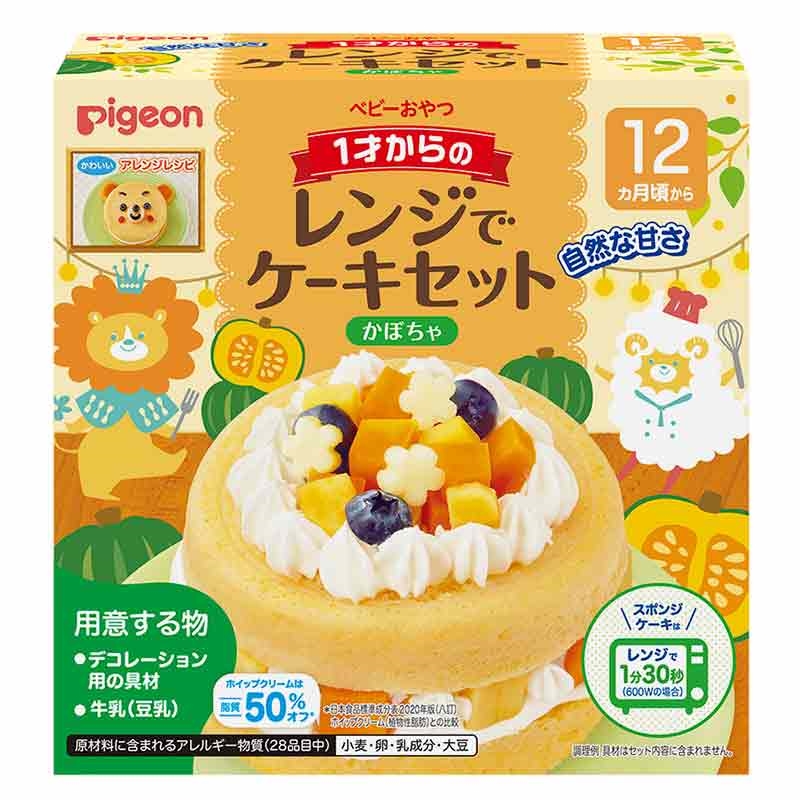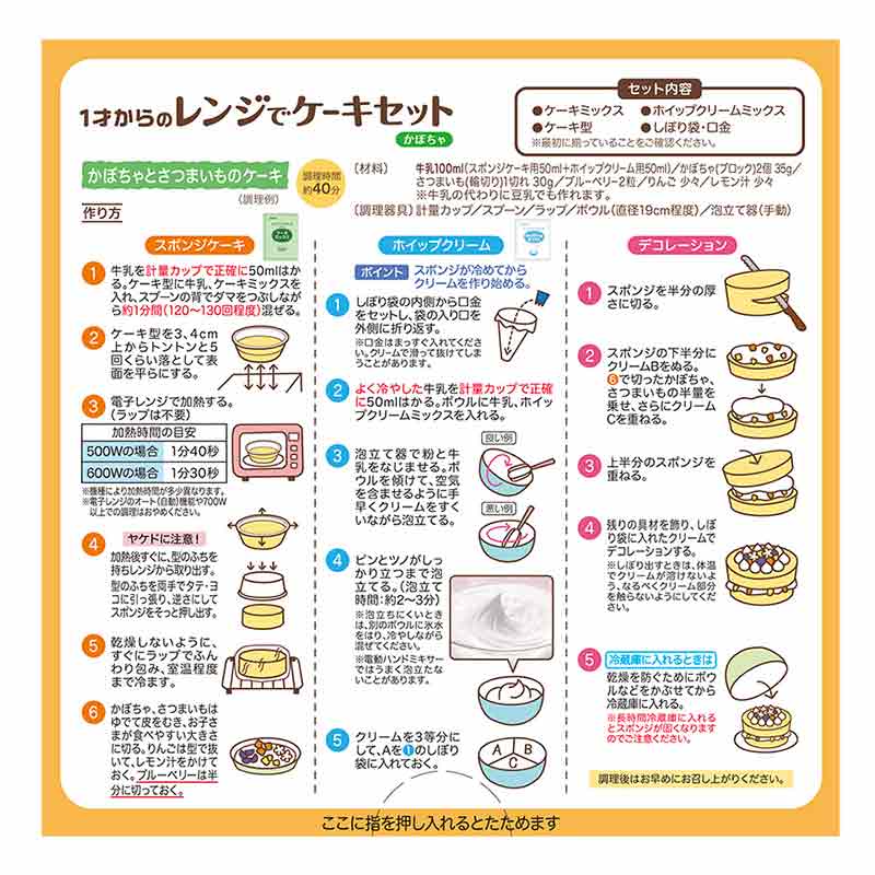 1才から食べられる手作りケーキセット。簡単・短時間で作れ、お子さまと一緒にケーキ作りが楽しめます。 牛乳50mlを入れて混ぜ、電子レンジで90秒加熱(600wの場合)で、スポンジケーキが作れます。 ケーキミックスに、ホイップクリーム粉末、ケーキ型、しぼり袋・口金もセット。すぐ作れます。 甘さ控えめ、ホイップクリームは脂肪分50%カット。 着色料・保存料は使用していません。