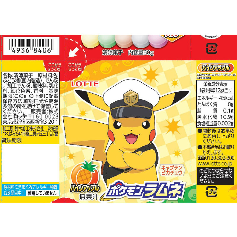 ●清涼菓子 ●原材料名:<パインアップル>ぶどう糖(国内製造)、でん粉/加工でん粉、酸味料、乳化剤、紅花色素、香料<メロン>ぶどう糖(国内製造)、でん粉/加工でん粉、酸味料、乳化剤、香料、着色料(紅花黄、クチナシ)<コーラ>ぶどう糖(国内製造)、でん粉/加工でん粉、酸味料、乳化剤、カラメル色素、香料<ソーダ>ぶどう糖(国内製造)、でん粉/加工でん粉、酸味料、乳化剤、香料<ぶどう>ぶどう糖(国内製造)、でん粉/加工でん粉、酸味料、乳化剤、香料、着色料(野菜色素、クチナシ) ●内容量:60g (パインアップル) ・栄養成分:1袋(標準12g)当り 熱量 45kcal たんぱく質 0g 脂質 0.1g 炭水化物 10.9g 食塩相当量 0.002g (メロン) ・栄養成分:1袋(標準12g)当り 熱量 45kcal たんぱく質 0g 脂質 0.1g 炭水化物 10.9g 食塩相当量 0.002g (コーラ) ・栄養成分:1袋(標準12g)当り 熱量 45kcal たんぱく質 0g 脂質 0.1g 炭水化物 10.9g 食塩相当量 0.004g (ソーダ) ・栄養成分:1袋(標準12g)当り 熱量 45kcal たんぱく質 0g 脂質 0.1g 炭水化物 10.9g 食塩相当量 0.002g (ぶどう) ・栄養成分:1袋(標準12g)当り 熱量 45kcal たんぱく質 0g 脂質 0.1g 炭水化物 10.9g 食塩相当量 0.002g