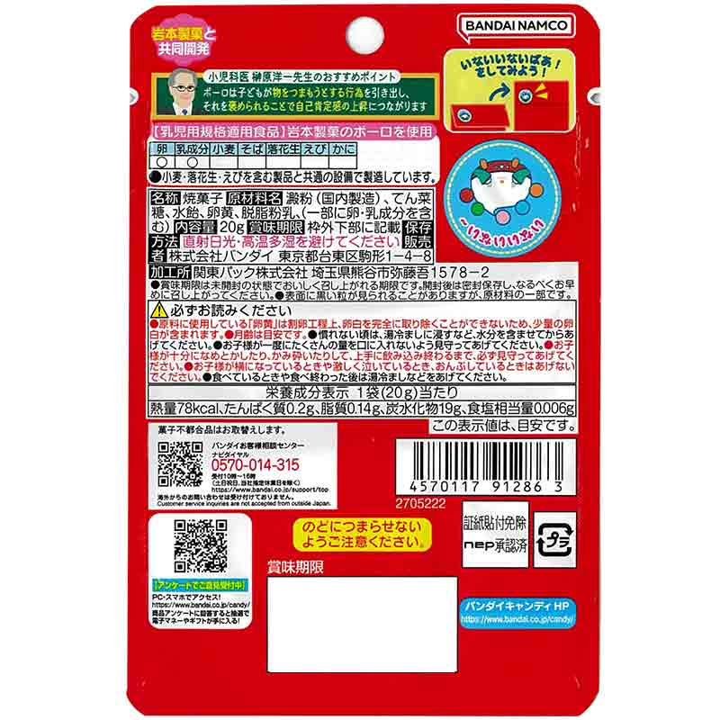 ●焼菓子 ●原材料名:澱粉(国内製造)、てん菜糖、水飴、卵黄、脱脂粉乳、(一部に卵・乳成分を含む) ●内容量:20g ●栄養成分:1袋(20g)当たり 熱量 78kcal たんぱく質 0.2g 脂質 0.14g 炭水化物 19g 食塩相当量 0.006g