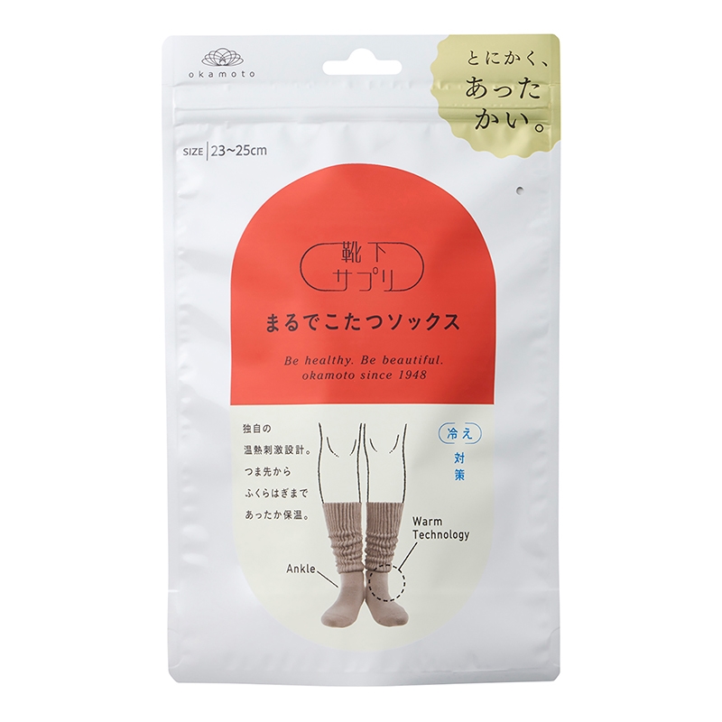 独自の編み方により、足首のツボである三陰交を温めます。 さらに、岡本独自開発の特殊保温・発熱素材を使用し今までより温かい靴下を実現しました。 リラックスしたいとき、お休み中に足が冷えるとき、冷えたフローリングが辛いときなどに冷え対策ができます。