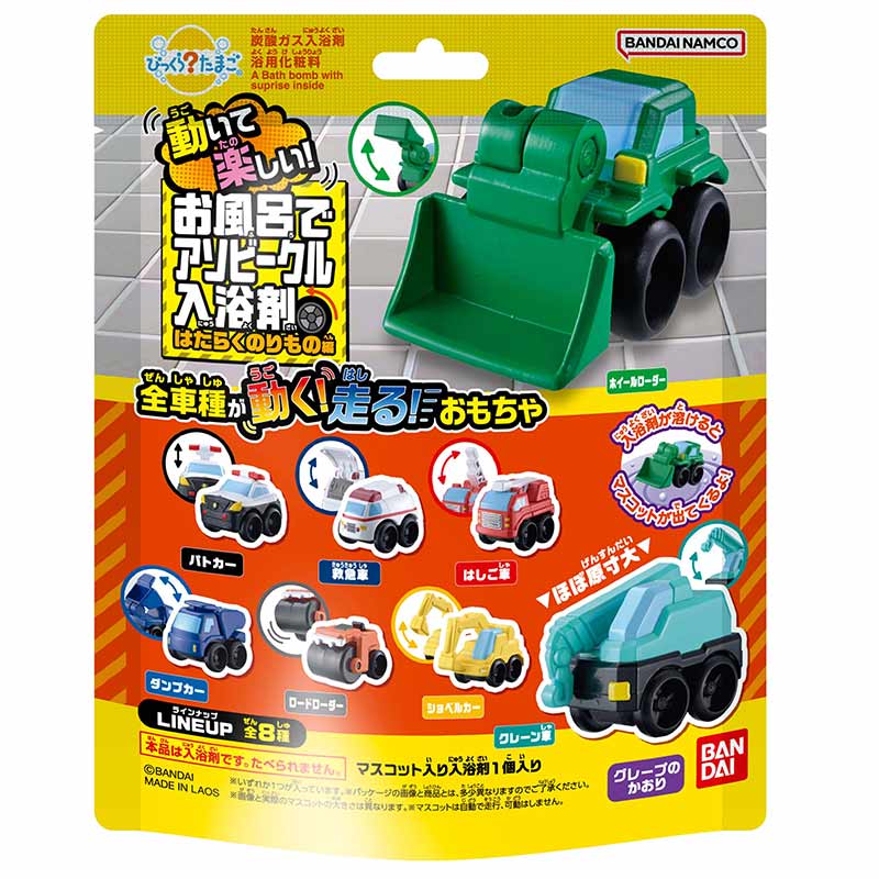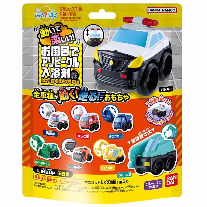お風呂でアソビークル、はたらくのりもの編のマスコットが登場 グレープの香り マスコットは全8種類 ※パッケージは2種類ございますが、お選びいただくことはできません。 複数個ご購入の場合、パッケージ柄が重複することがございます。 あらかじめご了承ください。
