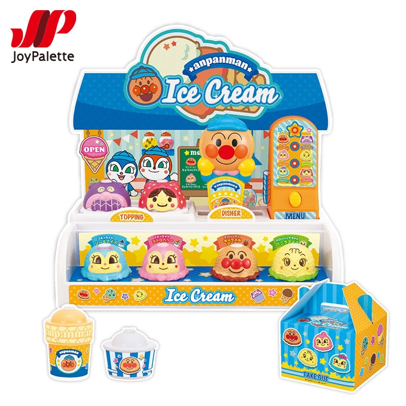 カップかコーンを選んで、ディッシャーで好きなアイスをのせよう! ダブル・トリプル・トッピング。好きなアイスをつくっちゃおう。 おしゃべりメニューボードはボタンを押してオーダー遊びができます。 アンパンマンとばいきんまんのおしゃべりが流れ、ごっこ遊びを盛り上げます。 またルーレットになるとピカピカ光ります。 付属のテイクアウトボックスにアイスを入れてお持ち帰り遊びもできます。 アンパンマンとなかまたちのお顔のかわいいアイスが4種類・トッピングが2種類付いています。
