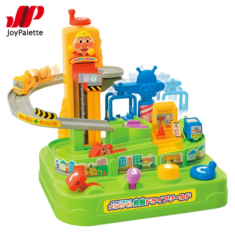 アンパンマンミキサー車とばいきんまんダンプカーを5つのスイッチで上手に走らせよう! エレベーターは赤いノブを回して工事カーを乗せて上げよう。 スロープを降りてくるっとターンテーブルに着いたら、紫のレバーを奥に倒して方向転換。 バイキンUFOクレーンに工事車を乗せたら青のノブを回して動かそう。 カーリフトに着いたら黄色のボタンを押して上の道に上げよう。 めいけんチーズの交通整理に着いたら赤のレバーを右に倒してエレベーターに進めよう。