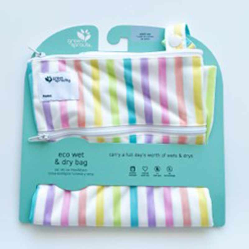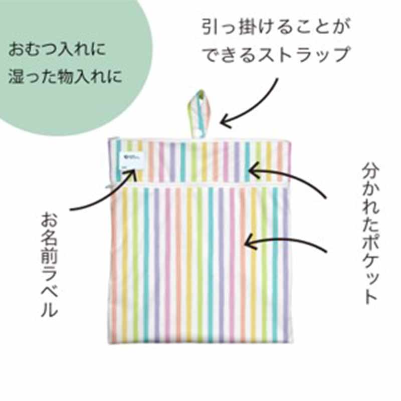 グリーンスプラウツのウエット&ドライバッグは、様々なものを収納できるマルチポーチ。 ポーチの内側は耐水性コーティングを施しているので、湿ったものなどを入れることも可能です。 2つの異なるポケットに分けておむつとおしりふきシートなども収納可能。