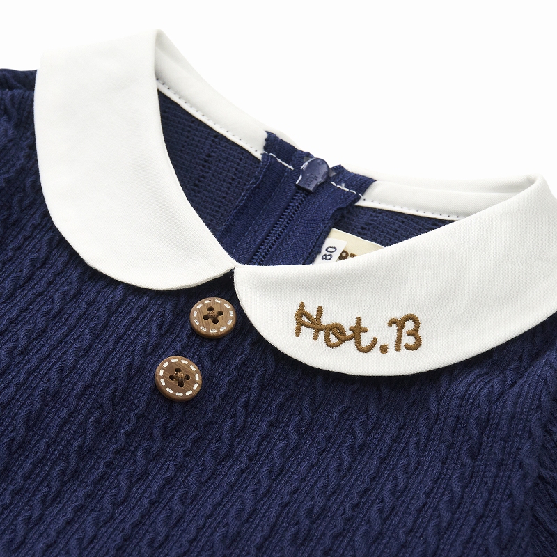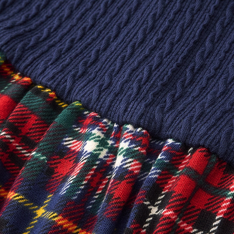 ●素材=ケーブルニット、(衿)ブロード、(スカート部分)裏毛パイルプリント ●品質=綿 91%、ナイロン 7%、ポリウレタン 2%、(衿・スカート部分) 綿 100% ●原産国=中国