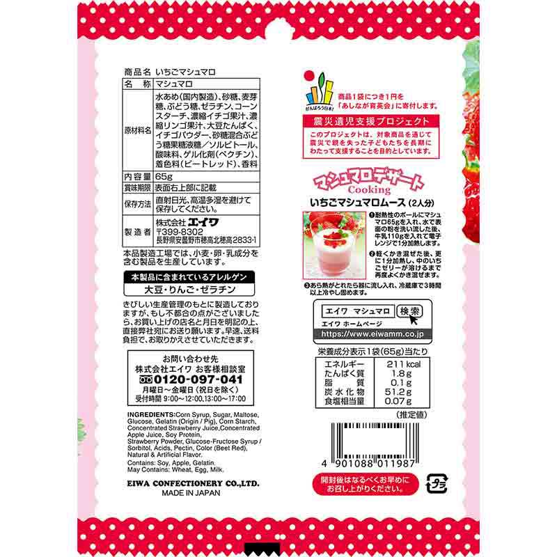 ●マシュマロ ●原材料名:水あめ(国内製造)、砂糖、麦芽糖、ぶどう糖、ゼラチン、コーンスターチ、濃縮イチゴ果汁、濃縮リンゴ果汁、大豆たんぱく、イチゴパウダー、砂糖混合ぶどう糖果糖液糖/ソルビトール、酸味料、ゲル化剤(ペクチン)、着色料(ビートレッド)、香料 ●内容量:65g ●栄養成分:その他 熱量 211kcal たんぱく質 1.8g 脂質 0.1g 炭水化物 51.2g ナトリウム -mg 食塩相当量 0.07g