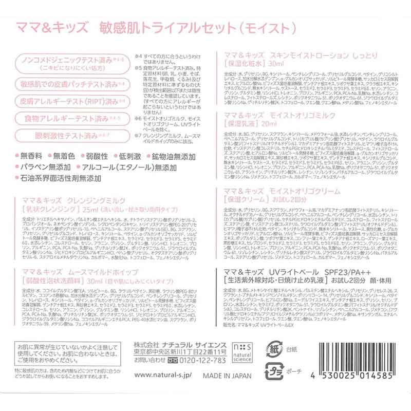 セット内容: ●クレンジングミルク 25ml ●ムースマイルドホイップ 30ml ●スキンモイストローション しっとり 30ml ●モイストオリゴミルク 20ml ●モイストオリゴクリーム サンプル2包 ●UVライトベール サンプル2包 ※透明ポーチ付き