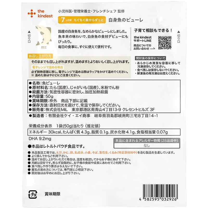 ●白身魚のピューレ ●原材料名:たら(国産)、じゃがいも(国産)、米粉でん粉 ●内容量:50g ●栄養成分:1個当たり 熱量 30kcal たんぱく質 4.3g 脂質 0.1g 炭水化物 4.1g ナトリウム mg 食塩相当量 0.07g