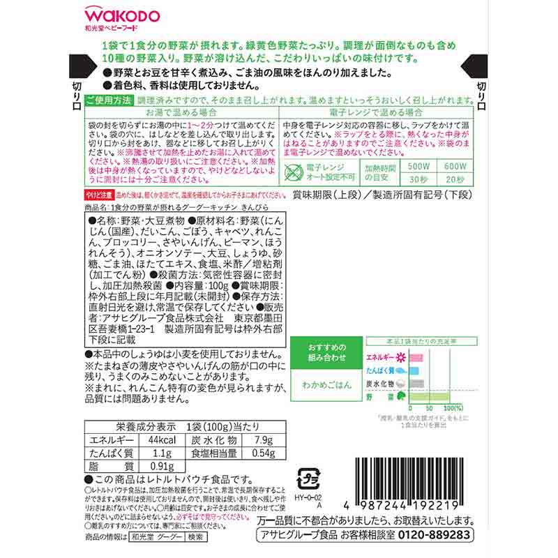 ●使用開始月齢:12ヵ月頃から ●原材料名:野菜(にんじん(国産)、ごぼう、だいこん、れんこん、ブロッコリー、さやいんげん、キャベツ、ピーマン、ほうれんそう)、たまねぎペースト、大豆、しょうゆ、砂糖、ごま油、ほたてエキス、食塩、米酢/増粘剤(加工でん粉) ●内容量:100g ●栄養成分:単位重量 1袋(100g)当たり エネルギー 47kcal たんぱく質 1.7g 脂質 1.3g 炭水化物 7.0g 食塩相当量 0.57g
