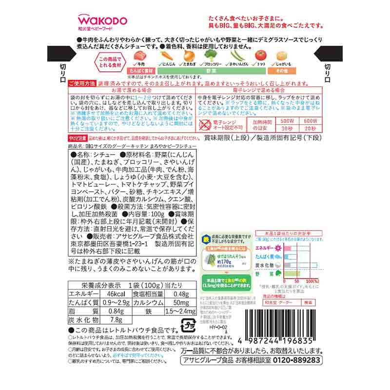 ●使用開始月齢:1歳4ヵ月頃から ●原材料名:野菜(にんじん(国産)、たまねぎ、ブロッコリー、さやいんげん)、じゃがいも、牛肉加工品(牛肉、でん粉、海藻粉末、食塩)、しょうゆ(小麦・大豆を含む)、トマトピューレー、トマトケチャップ、野菜ブイヨンペースト、バター、砂糖、チキンエキス/増粘剤(加工でん粉)、炭酸カルシウム、クエン酸、ピロリン酸鉄 ●内容量:100g ●栄養成分:単位重量 1袋(100g)当たり エネルギー 46kcal たんぱく質 0.9~2.9g 脂質 0.84g 炭水化物 7.8g 食塩相当量 0.48g カルシウム 50mg 鉄 1.5~2.4mg