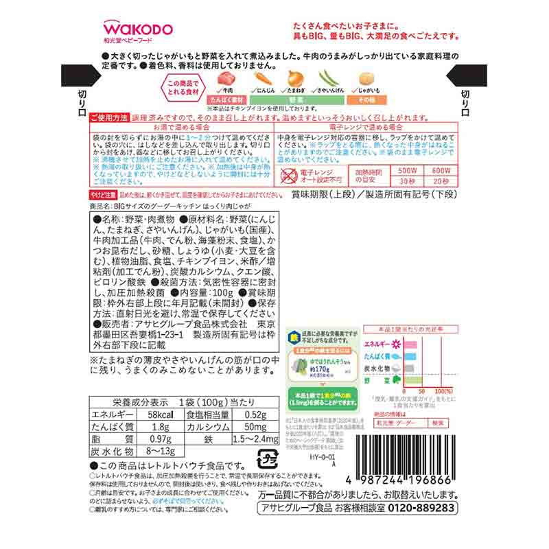 ●使用開始月齢:1歳4ヵ月頃から ●原材料名:野菜(にんじん、たまねぎ、さやいんげん)、じゃがいも(国産)、牛肉加工品(牛肉、でん粉、海藻粉末、食塩)、かつお昆布だし、砂糖、しょうゆ(小麦・大豆を含む)、植物油脂、食塩、チキンブイヨン、米酢/増粘剤(加工でん粉)、炭酸カルシウム、クエン酸、ピロリン酸鉄 ●内容量:100g ●栄養成分:単位重量 1袋(100g)当たり エネルギー 58kcal たんぱく質 1.8g 脂質 0.97g 炭水化物 8~13g 食塩相当量 0.52g カルシウム 50mg 鉄 1.5~2.4mg