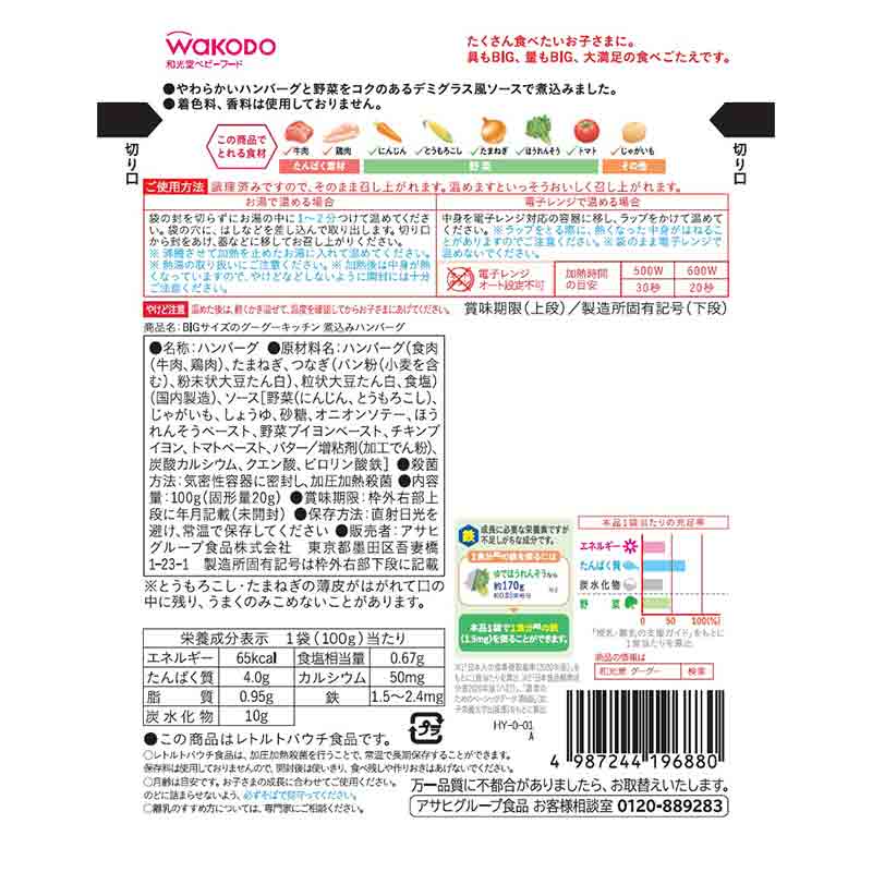 ●使用開始月齢:1歳4ヵ月頃から ●原材料名:ハンバーグ(食肉(牛肉、鶏肉)、たまねぎ、つなぎ(パン粉(小麦を含む)、粉末状大豆たん白)、粒状大豆たん白、食塩)(国内製造)、ソース[野菜(にんじん、とうもろこし)、じゃがいも、しょうゆ、砂糖、オニオンソテー、ほうれんそうペースト、野菜ブイヨンペースト、チキンブイヨン、トマトペースト、バター/増粘剤(加工でん粉)、炭酸カルシウム、クエン酸、ピロリン酸鉄] ●内容量:100g(固形量20g) ●栄養成分:単位重量 1袋(100g)当たり エネルギー 65kcal たんぱく質 4.0g 脂質 0.95g 炭水化物 10g 食塩相当量 0.67g カルシウム 50mg 鉄 1.5~2.4mg