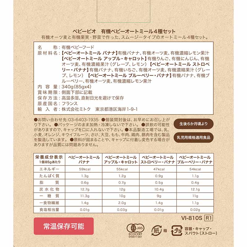 有機果実と野菜すり潰したスムージータイプのオートミールです。 人気4種をお得なセットにしました。 生後6ヵ月よりお召し上がり頂けます。 有機JAS認証品。 開封後はすぐにお召し上がり下さい。