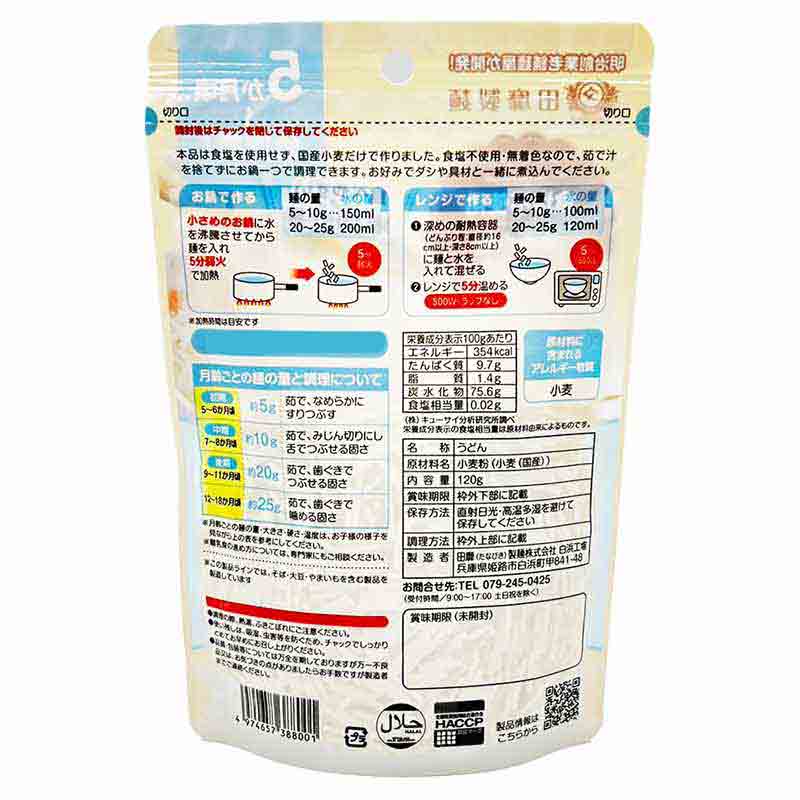 ●内容量:120g ●原材料:小麦粉(小麦(国産)) ●調理時間:5分 ●保存方法:直射日光高温多湿を避けて保存