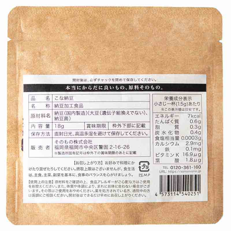 ひとさじで、栄養バランスと納豆菌 納豆好きな方に、料理に納豆の風味を出したい時に ●こな納豆(通常タイプ) こな納豆は、納豆が持つ有用成分を生かすため、フリーズドライ製法で納豆を粉末にしています。 納豆の栄養価はそのままに、生きたまま腸まで届く芽胞状の納豆菌も手軽に摂ることができます。 こな納豆の原材料は、佐賀県江北町で栽培された大豆(遺伝子組み換えでない、化学農薬・化学肥料不使用)を当社独自のそのもの納豆菌(遺伝子組み換えでない)で発酵した納豆のみ、添加物は一切使用しておりません。 サラサラとした微粒で、いつもの食事に混ぜるだけで料理のコクや旨味が増し、とろみによって咀嚼や飲み込みがしやすくなるので、赤ちゃんの離乳食にもおすすめです。 ●通常タイプはこんな料理におすすめ 通常タイプは、納豆の匂いや粘りがよく出ますので、納豆の風味を料理に活かしたい時、納豆好きなお子さんにおすすめ。 お味噌汁に混ぜたり、おやき、ふりかけ、パスタ、バニラアイスなどにお使いください。 ●保存に便利なスタンドチャック袋 ●保存性の高いアルミ蒸着袋を使用 ●専用スプーン付属
