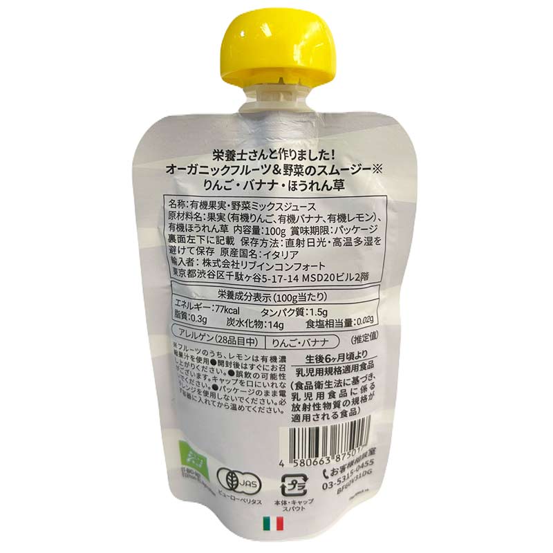 水、砂糖、保存料、着色料不使用でフルーツ&野菜100%のオーガニックスムージー。 生後6ヵ月頃からの離乳食、おやつ、料理の隠し味など多様な使い方ができます。 耐熱容器に移して温めれば、離乳食のアレンジにもお使いいただけます。 ・水、砂糖、保存料、着色料、香料不使用 ・原材料は有機フルーツ100g ・グルテンフリーのため消化にもやさしい ・生後6ヶ月頃から食べられる ・乳児用規格適用食品 ・たっぷり100g ・なめらかな舌触りで飲み込みやすい ・日本に比べ日照時間の長いイタリアで採れた、芳醇なりんごを使用 ・皮や芯、種をすべて丁寧に取り除き果肉だけをふんだんに使用 ・お子様も喜ぶ可愛いパッケージ ・管理栄養士監修で安心のレシピ