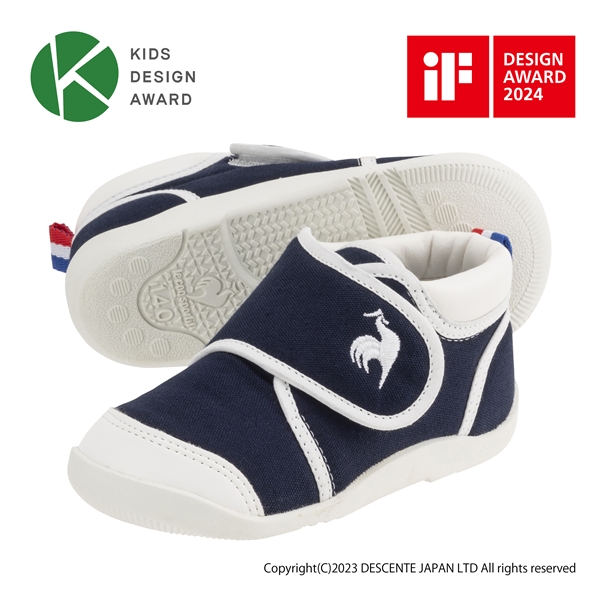 歩き始めたお子さまに向けたファーストシューズです。アッパーには2本のベルトを採用する事でフィット感を高めるように設計しました。歩きやすさを考慮し、かかとを安定させ、カラダのバランスを取りやすくする為に外側より内側のヒールカウンターを長くしました。屈曲性のあるラバーのアウトソールには内側への倒れ込みを考慮した意匠を採用。快適な足入れと歩行時の内側への倒れ込みを考慮した設計です。前作よりも脱ぎ履きのしやすさを追求し、履き口を大きく開く設計にしました。インソール裏面には歩行時の屈曲を補助する溝を搭載し表面には足先に段差があり5本指での踏み込みをサポートします。