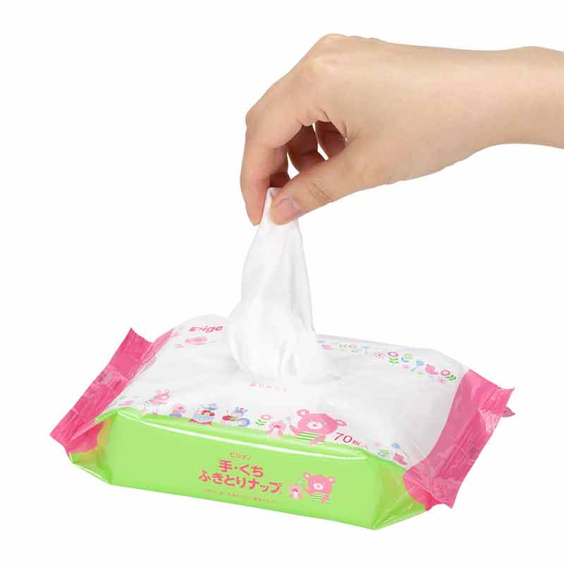 100%食品用原料成分でできたふきとり成分で、お子さまの手や口のまわりにお使いいただけるウェットティシュです。 やわらかな肌ざわりのティシュで、汚れをやさしくふき取れます。 ・おくちまわりの汚れに(ミルク汚れにも) ・おでかけ時の手の汚れに ・ごはんやおやつの食べこぼしに ・無着色・無香料・ノンアルコール。 ・皮フ科医による皮フ刺激性テスト済み(すべての方に肌トラブルが起きないというわけではありません) ・からだふきにも使えます 必ず使い方・使用上の注意をお読みください。 (使い方) 表についているシールのOPEN の部分をつまんで開け、1枚ずつ取り出してお使いください。