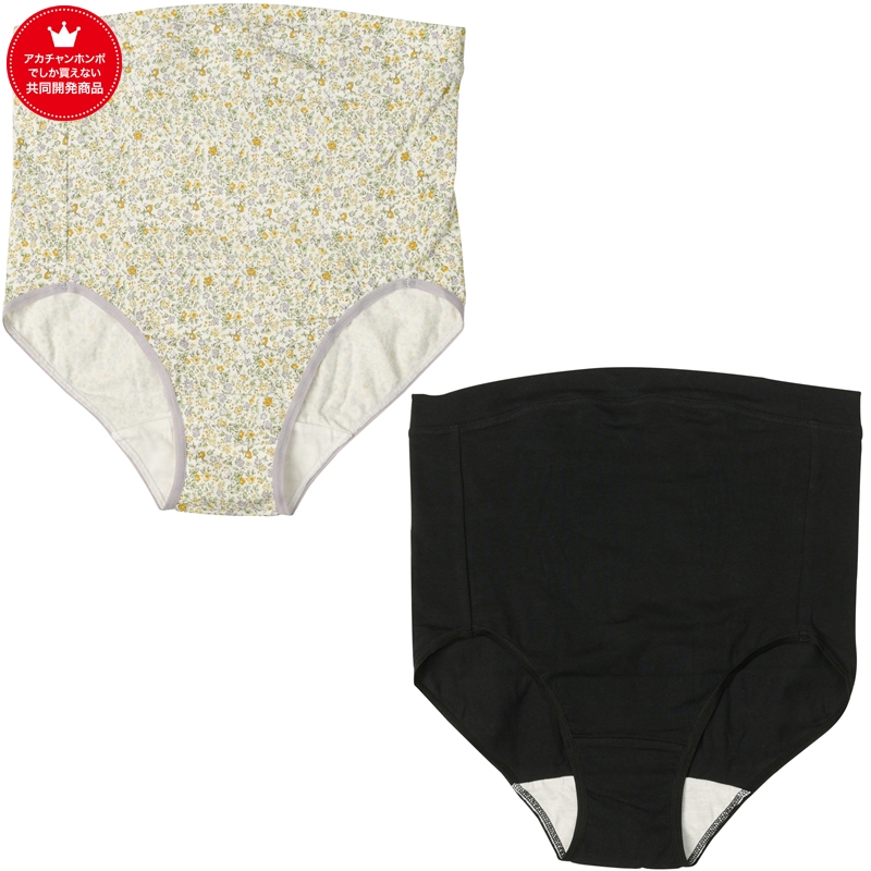 一般のショーツと比べ、股上が深く大きくなるお腹をすっぽり包みこみます。 ウエスト部分は、ウエストゴムを使用せず、身生地を折り返ししている事で、面で支えてフィットするお腹を締め付けにくい仕様です。 マチ部分は白地の綿素材で、妊娠中のおりものの状態をチェックできます。