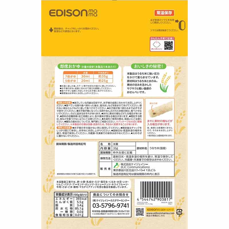 ●対象月齢:7ヵ月頃~ ●名称:米菓 ●原材料:うるち米(山形県) ●内容量:35g ●保存上の注意 ・お子様の手の届かない所に保存してください。 ・開封後はチャックをしっかり閉じて保存し、お早めにお召し上がりください。 ・直射日光・高温多湿の場所を避け、常温で保存してください。 ・冷蔵庫、冷凍庫での保存はおやめください。 ・火のそばに置かないでください。 ●その他 ・表示している月齢は目安です。お子様の成長に合わせてお召し上がりください。 ・食べている時や、食べ終わった後は、湯冷ましなどを飲ませてあげてください。慣れない頃は、湯冷ましに浸すなど、水分を含ませてからあげてください。 ・お子様が食べ終わるまで必ずそばで見守ってください。 ・お子様が横になっている時や、おんぶされた状態の時は、与えないでください。のどに詰まるおそれがあります。 ・まれに素材の塊などが入る場合があります。 ・原料の収穫時期、加工時期により、色や風味が異なる場合があります。 ・開封する際は、指などを傷つけないようにご注意ください。 ・品質保持のため、乾燥剤を封入しています。食べ物ではありませんので、開封後は捨ててください。 ・お湯をご使用の際は、取扱いにご注意ください。 ・離乳の進め方については、専門家にご相談ください。※パッケージは大切に保管してください。 ●本品の製造工場では、卵・乳成分・小麦・えび・かに・落花生を含む製品を製造しています。