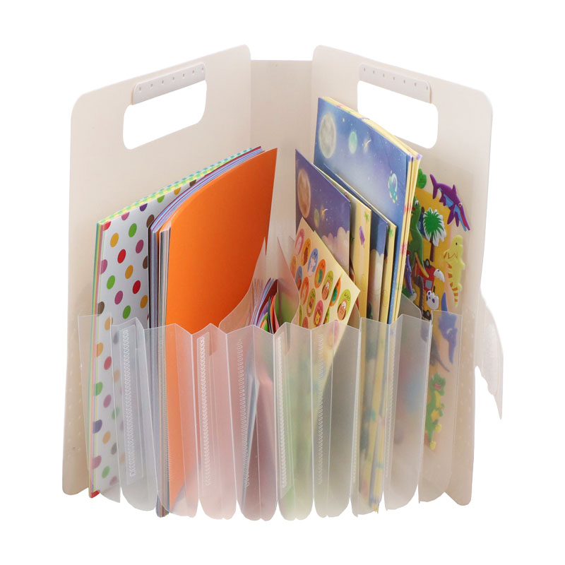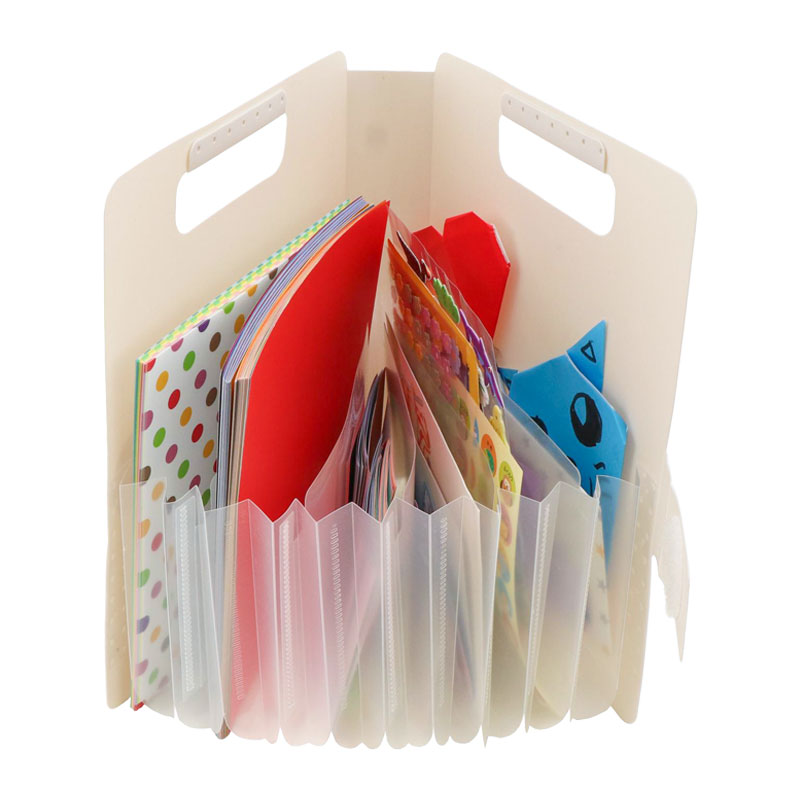 折り紙やシールなど細々した文具が収納できます。 ハンドルつきで持ち運びしやすい仕様です。 面ファスナーで簡単にとめられます。 自立するので中身が一覧できて選びやすくなっています。 幅広サイズポケットで出し入れしやすい仕様です。