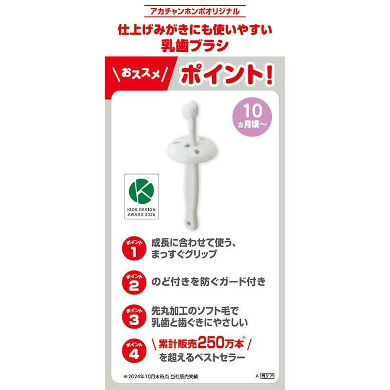 ソフトな毛で乳歯と歯ぐきにやさしい。 しっかりにぎれる太めのグリップで仕上げみがきにも使いやすい。 のど突きを防ぐガード付。