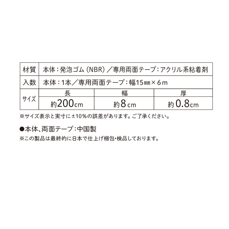 ●内容量:1個入り ●本体材質:NBR ●本体サイズ(約・㎜):80×長2000×厚9 ●両面テープ付属