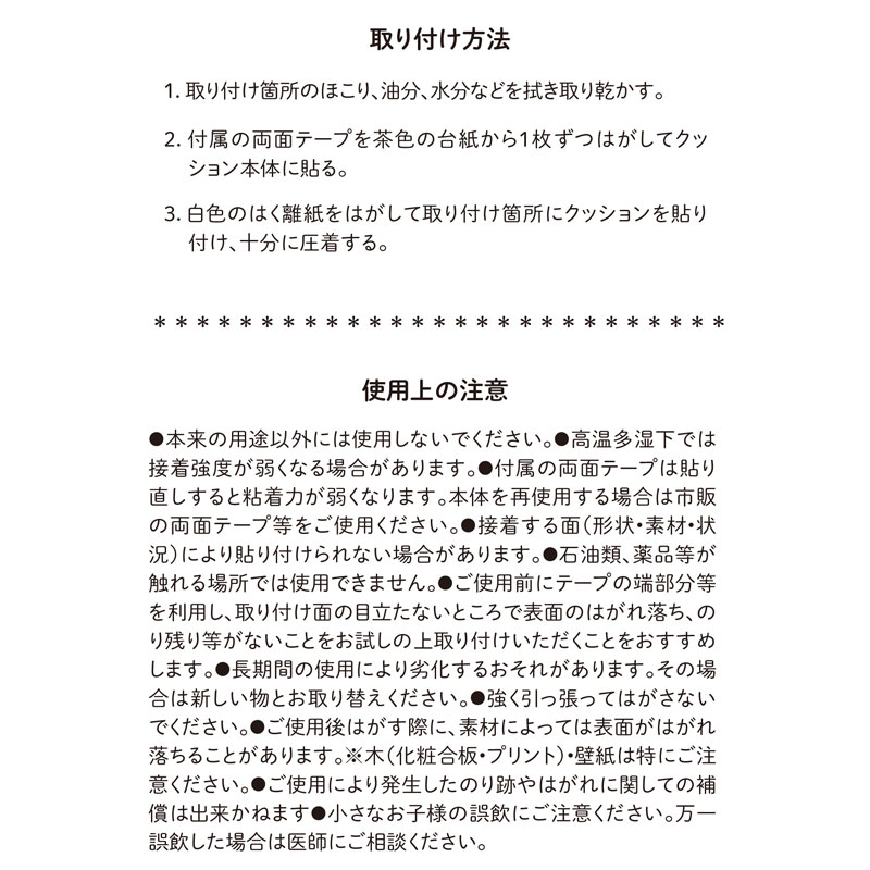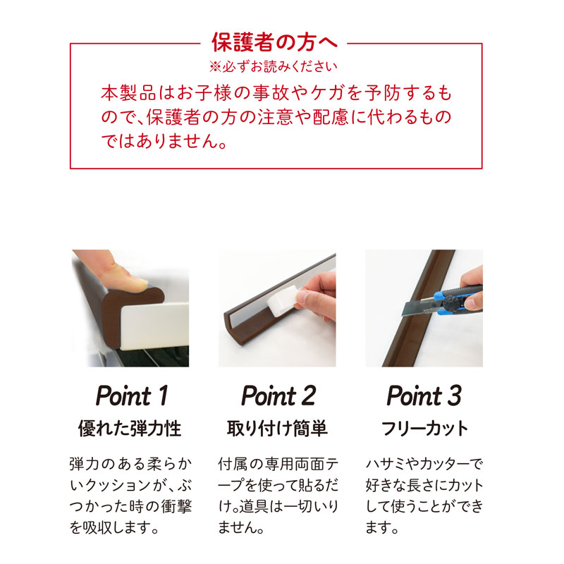 ・発泡ゴム特有のやわらかさで、ぶつかりの衝撃を吸収します。 ・ゴムの配合を多めにしてちぎれにくくなっています。 ・糊後の残りにくい両面テープが付属していますので剥がす時もキレイに剥がれます。 ・厚み9ミリタイプで見た目もスッキリしています。 ・同じサイズのコーナーパットと組み合わせることで危険な角を全てカバーします。