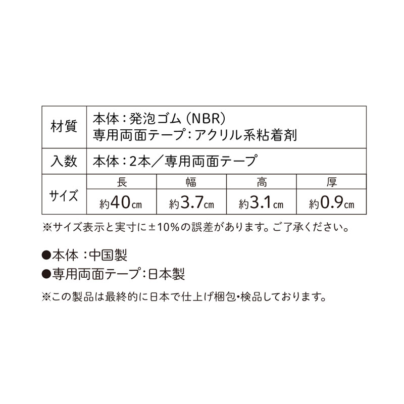 ●セット内容:2個入り ●本体材質:NBR ●本体サイズ(約・mm):幅37×長400×高31 ●厚み(約・mm):9 ●両面テープ付属