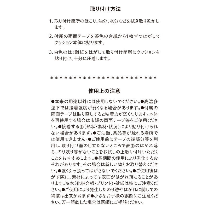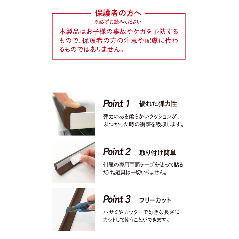 ・発泡ゴム特有のやわらかさで、ぶつかりの衝撃を吸収します。 ・ゴムの配合を多めにしてちぎれにくくなっています。 ・糊後の残りにくい両面テープが付属していますので剥がす時もキレイに剥がれます。 ・厚み6ミリタイプで見た目もスッキリしています。 ・同じサイズのコーナーゴムパットと組み合わせることで危険な角を全てカバーします。