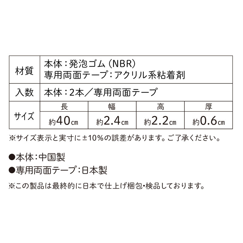 ●セット内容:2個入り ●本体材質:NBR ●本体サイズ(約・mm):幅24×長400×高22 ●厚み(約・mm):6 ●両面テープ付属