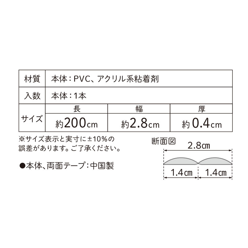 ●セット内容:2m×1本入り ●本体材質:PVC ●本体サイズ(約・mm):幅28×長2000×高4 ●両面テープ付属