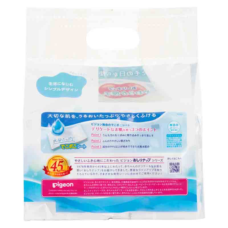 やさしくうるおいふきごごちさっぱり 水分たっぷりでこポこシート 大切な肌を、うるおいたっぷりやさしくふける ●おしりナップ やわらか厚手仕上げの商品特長 ・ピジョン独自のでこポこシートデリケートなお肌を想う3つのポイント Point 1 うんち汚れをくぼみに取り込みすっきり落とす Point 2 ふんわりやさしい肌ざわり Point 3 成分の99%以上が純水でできた化粧水配合 ・純水100% 無添加 PG、パラベン、IPBC、アルコール、着色料、香料 ・皮フ科医による皮フ刺激性テスト済み (すべての方に皮フ刺激が発生しないということではありません) ・体や手足ふきにも使えます ●注意事項 ・お肌に異常が生じていないか、よく注意してご使用ください。使用中、又は使用したお肌に直射日光があたって、赤み・はれ・かゆみ・刺激・色抜け(白斑等)や黒ずみ等の異常が現れた場合は、使用を中止し、皮フ科専門医などへご相談ください。そのまま使用を続けますと症状が悪化することがあります。 ・眼や粘膜および傷口には使用しないでください。 ・中身の乾燥を防ぐため、使用後はしっかりとシールを閉め、なるべく早めにご使用ください。 ・お子様に配慮した成分を使用しておりますが、使用に際しては、お子様の誤飲・誤食にご注意ください。 ・このティシュは水に溶けませんので、トイレには捨てないでください。 ・内容成分(原材料)のにおいが感じられる場合がありますが、品質には問題ありません。 ・ティシュや包装フィルムが変色する場合がありますので、温めて使用することはお避けください。 ・トイレに流さないでください ・皮フ科医による皮フ刺激性テスト済み(すべての方に皮フ刺激が発生しないということではありません) ・必ず個袋の底面の使い方・使用上の注意をお読みください。 ●保存方法 ・乳幼児の手の届かないところに保管してください。 ・直射日光のあたる場所や、高温のところには保管しないでください ※パッケージデザインが、画像と異なる場合がございます。
