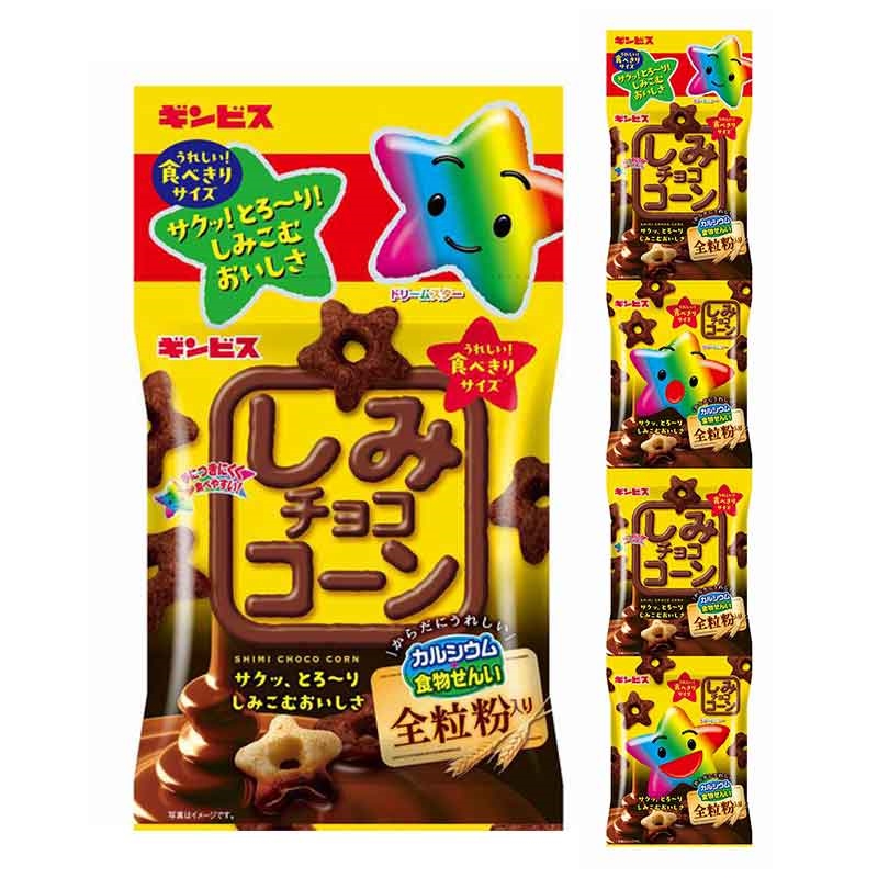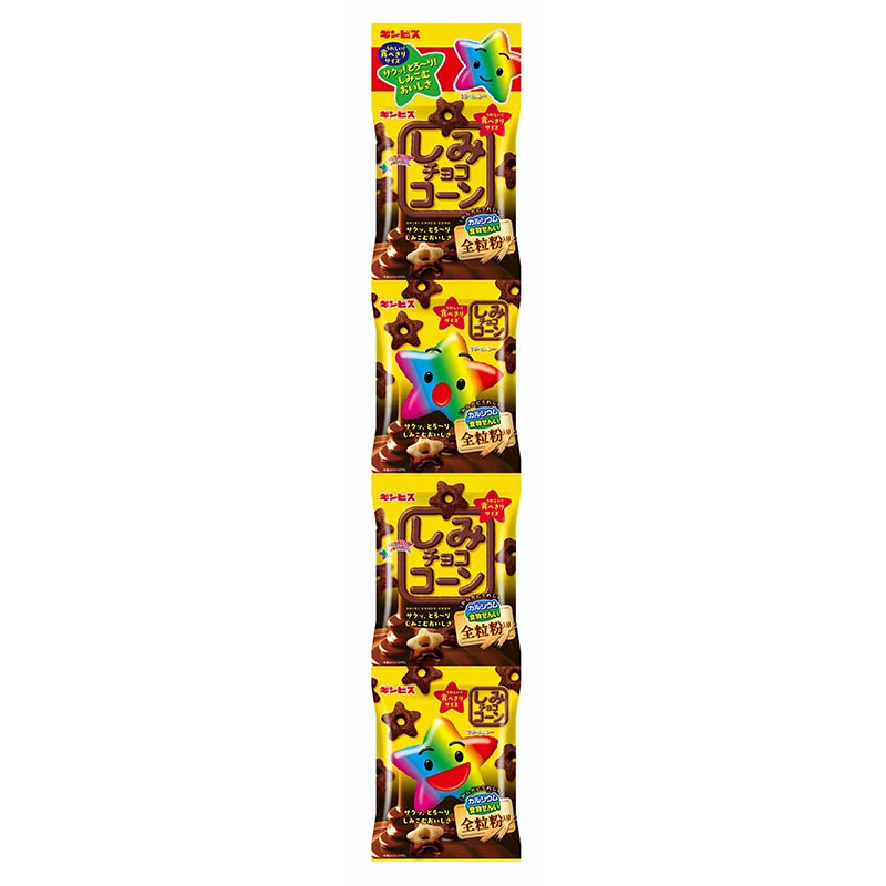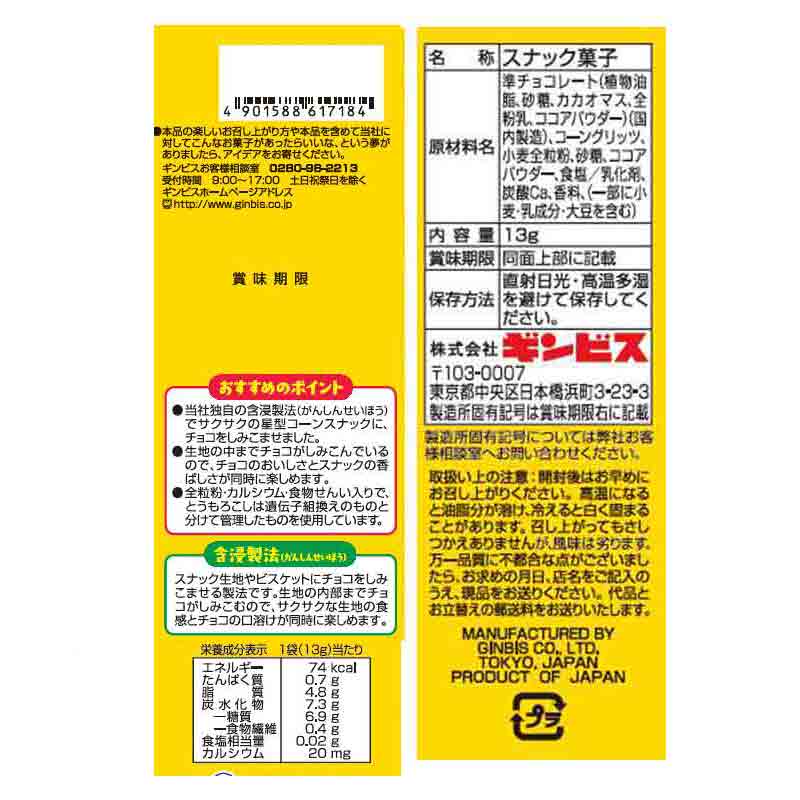●スナック菓子 ●原材料名:準チョコレート(植物油脂、砂糖、カカオマス、全粉乳、ココアパウダー)(国内製造)、コーングリッツ、小麦全粒粉、砂糖、ココアパウダー、食塩/乳化剤、炭酸Ca、香料、(一部に小麦・乳成分・大豆を含む) ●内容量:13g ●栄養成分:その他 熱量 74kcal たんぱく質 0.7g 脂質 4.8g 炭水化物 7.3g 糖質 6.9g 食物繊維 0.4g カルシウム 20mg