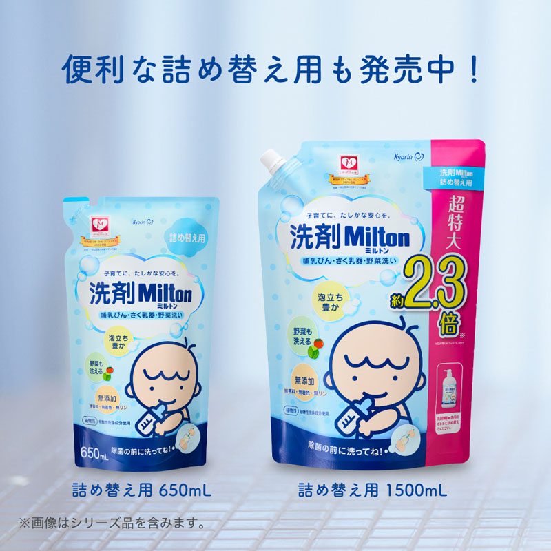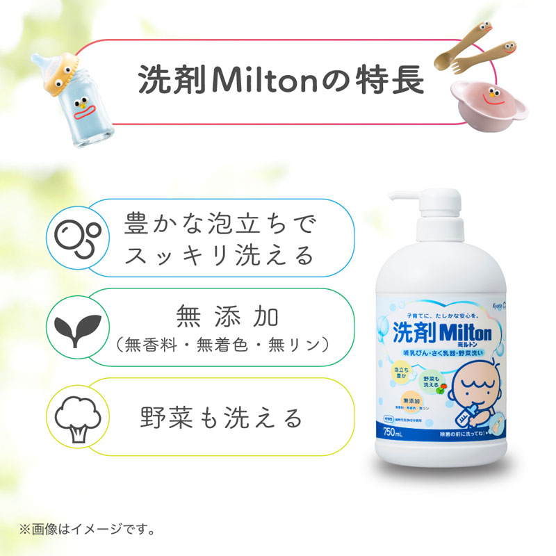 ●内容量:650ml ●ご使用方法: 赤ちゃんの口に直接触れるベビーグッズ:洗剤Miltonをブラシやスポンジに1プッシュとって洗い、水で充分にすすぎます。 離乳食用の野菜や果物:水1Lに対し、洗剤Milton1.5mLを溶かして2~3分浸した後、水で充分にすすぎます。