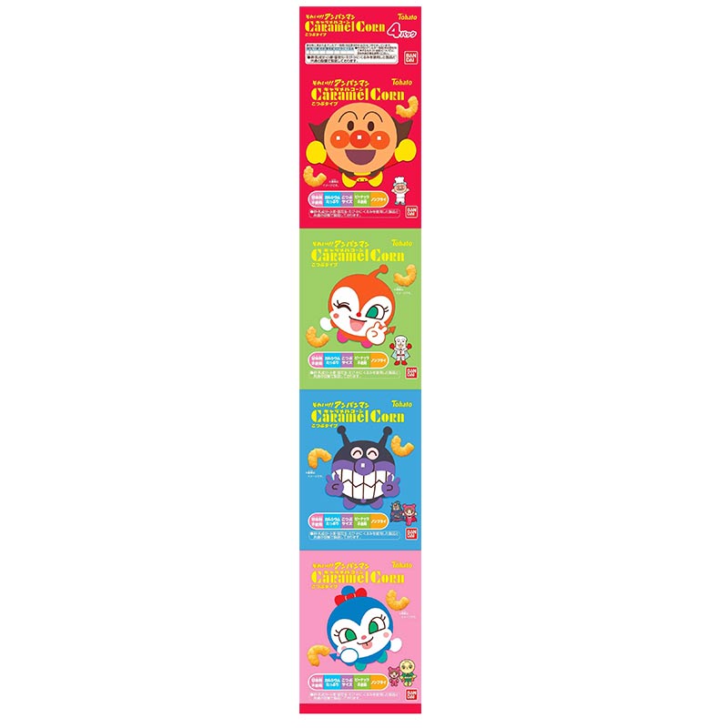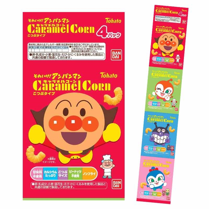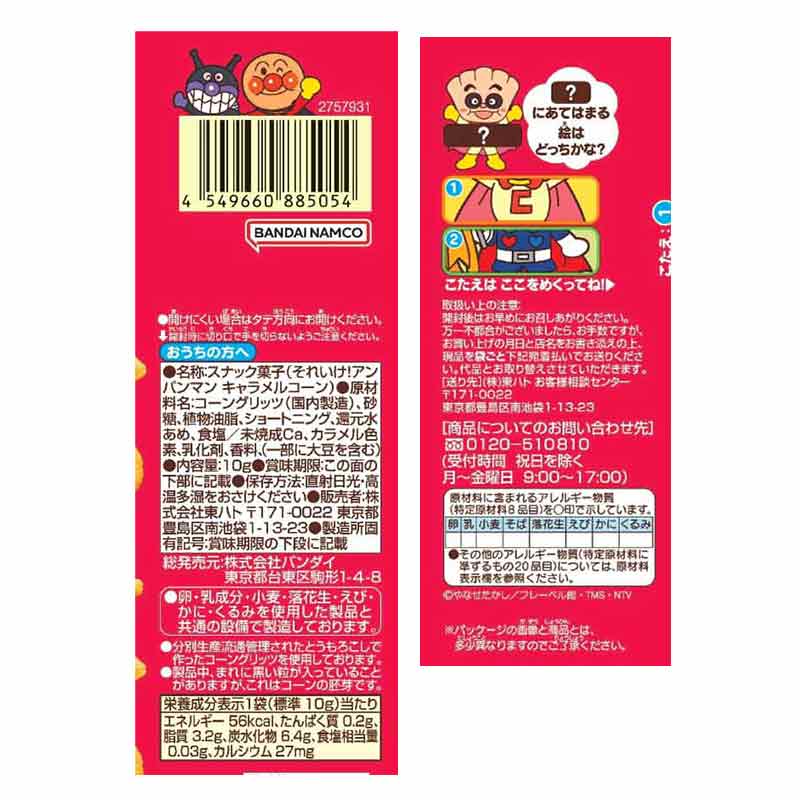 ●スナック菓子(それいけアンパンマン キャラメルコーン) ●原材料名:コーングリッツ(国内製造)、砂糖、植物油脂、ショートニング、還元水あめ、食塩/未焼成Ca、カラメル色素、乳化剤、香料、(一部に大豆を含む) ●内容量:10g ●栄養成分:その他 熱量 56kcal たんぱく質 0.2g 脂質 3.2g 炭水化物 6.4g ナトリウム -mg カルシウム 27mg