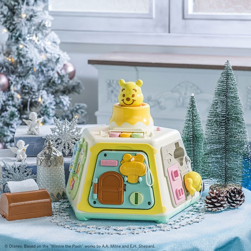 ●対象月齢:6ヵ月~ ●パッケージサイズ(約・mm):W300×H310×D230 ●梱包内容: 本体×1 取り外し知育ボード×1 プーさんのラトル×1 ティッシュボックス×1 はちみつ×1 ブロック(丸)プーさん×1 ブロック(六角)ティガー×1 ブロック(三角)ピグレット×1 ●材質: [本体・取り外し知育ボード]POM・ABS・PP [プーさんのラトル・はちみつ・ブロック3種]ABS [ティッシュボックス]PP・ポリプロピレン [ひも]ナイロン ●電池:単4形アルカリ乾電池×3(別売) (C) Disney. Based on the ”Winnie the Pooh” works by A.A.Milne and E.H.Shepard.