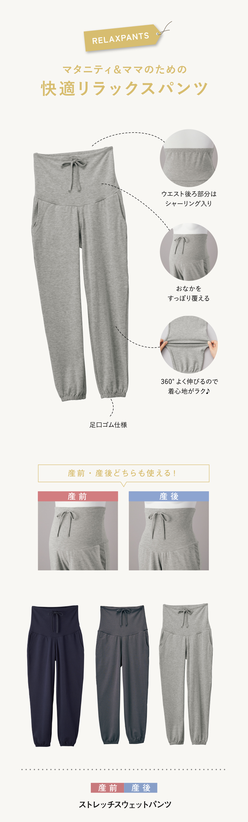 360°伸びるストレッチ裏毛素材でやわらかくはきごこちのよいパンツです。 ウエストに調節紐と背中部分のゴム入りで、産前から産後までお腹のサイズに合わせてほどよくフィットします。 足口はゴム入りでもたつかず、すっきり快適。 おうちでゆったりリラックスするときにもおすすめです。
