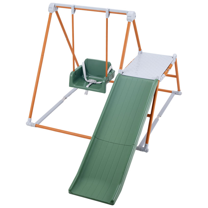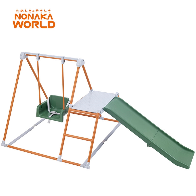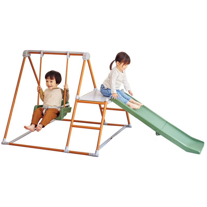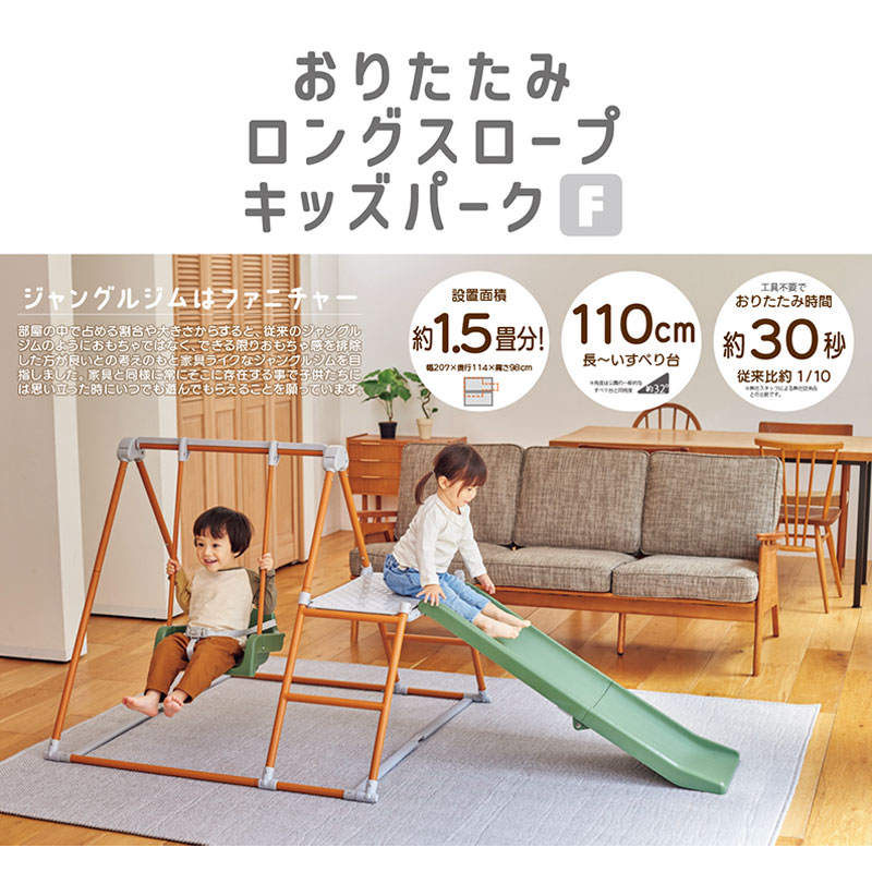 [ジャングルジムはファニチャー] 元気応援遊具 体を使って遊びながら運動能力を身につける家具ライクなジャングルジム これ1台で4つの遊びが楽しめる ●ジャングルジム●ブランコ●すべり台●鉄棒 ・部屋の中で占める割合や大きさからすると、従来のジャングルジムのようにおもちゃではなくできる限りおもちゃ感を排除した方が良いという考えのもと、 家具ライクなジャングルジムを目指しました。 ・家具と同様に常にそこに存在することで子供たちには思い立った時にいつでも遊んでもらえることを願っています。 ・長さ110cmの長~いすべり台にブランコ付き。 ・それでいてお部屋で圧迫感がないように全体的にボリュームを抑えたシンプル&すっきりデザイン。 ・設置面積は約1.5畳の省スペース。工具不要で約30秒で折りたためます。