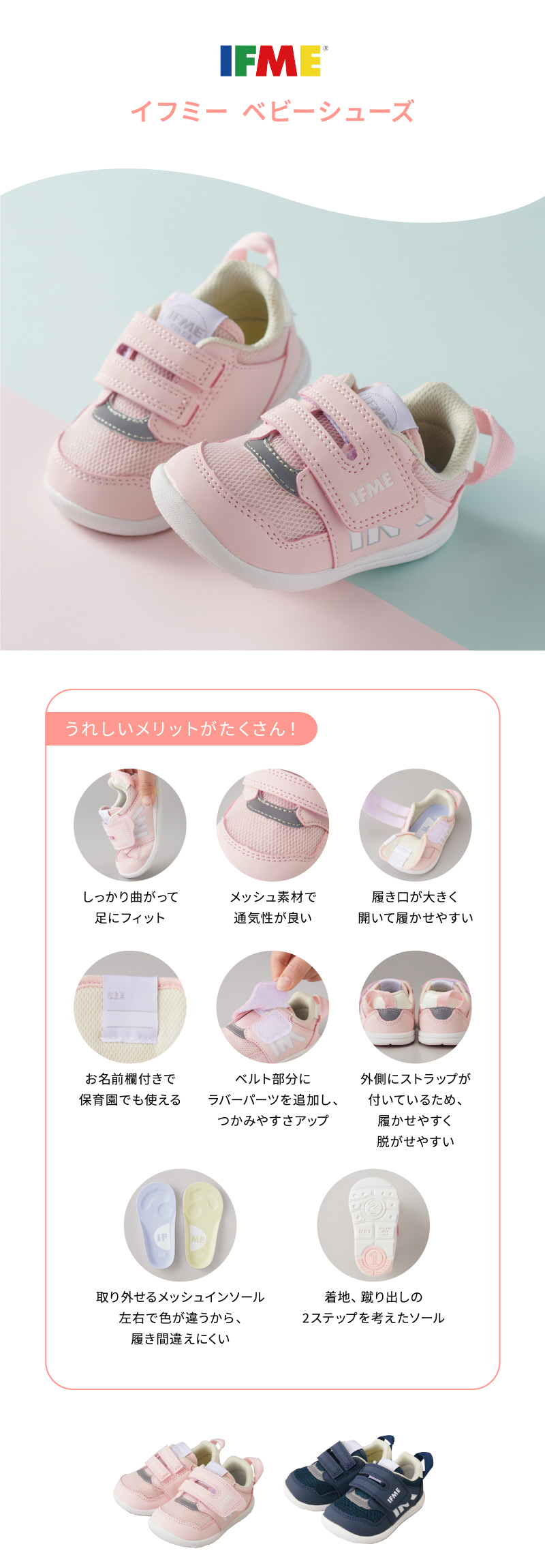 子供たちの足のことを考えたIFMEベビーシューズ。 育ち盛りの足をしっかり守ってくれます。 履き口が大きく開くベルト構造になっているので、お子様自身が自分で履いたり脱がせたりするのが簡単になっています。