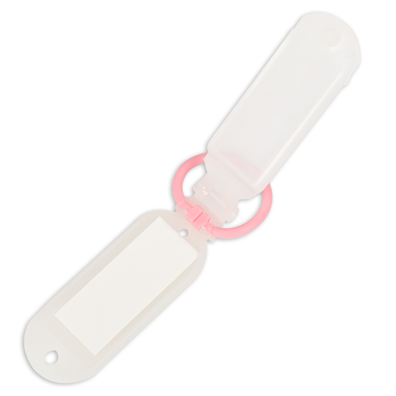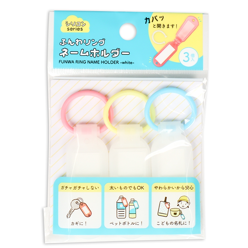 キーリングにシリコンゴムを使用した名札です。 柔軟性、伸縮性があるため、様々なシーンで使いやすく、周りに傷を付けにくくなっております。 濡れても錆びないので杖や傘の名札にも使えます。 伸縮性があるので、ペットボトルのような太いものにも付けられます。