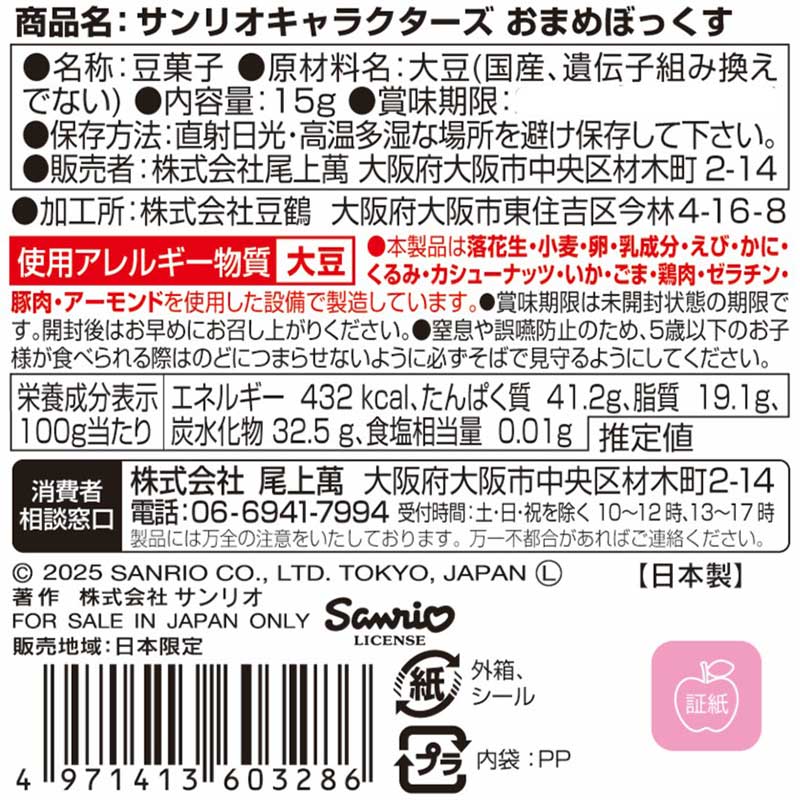 ※パッケージはお選びいただけません。複数個ご購入の場合、デザインが重複することがございます。 予めご了承ください。 サンリオキャラクターズの節分イラストがデザインされた、豆入りのボックスです。 側面の柄がすべて異なる2種アソートとなっておりいろいろなイラストが楽しめます。 また、全4種類のサンリオキャラクターズのおまけシール1枚がランダムでついています。 (C)SANRIO